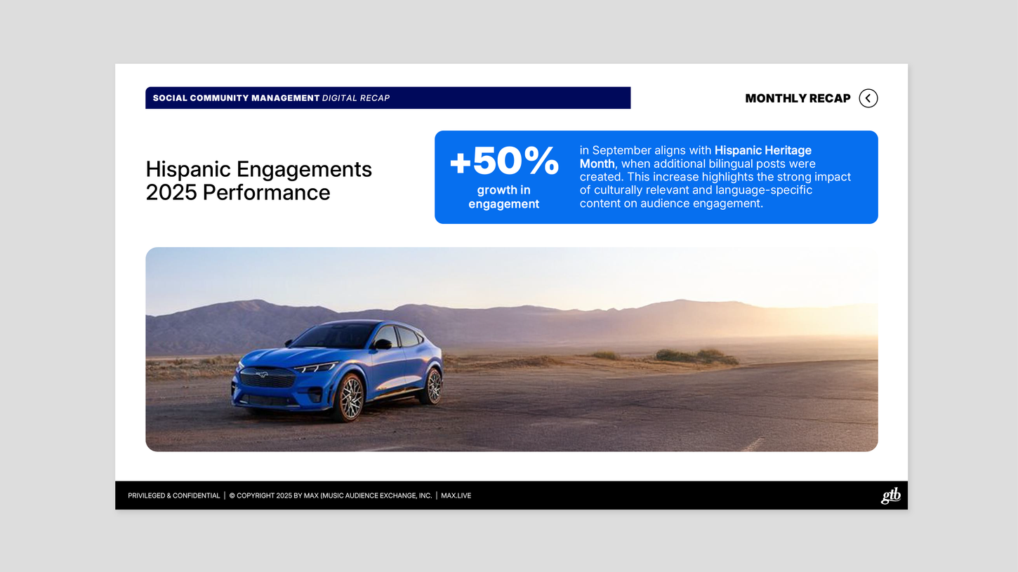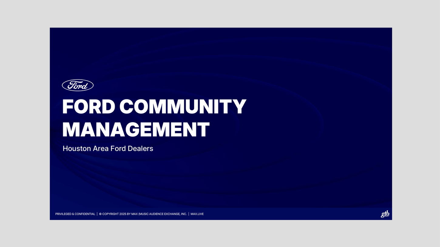 Social performance report created in collaboration with MAX and GTB to present monthly analytics for the Houston Area Ford Dealers. The deck was designed as a reusable template to highlight community engagement, cultural activations, and social growth metrics, demonstrating how localized storytelling and clear data visualization enhance client reporting and strengthen brand connection.